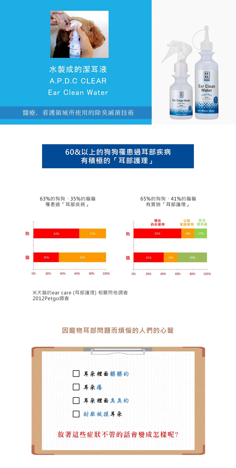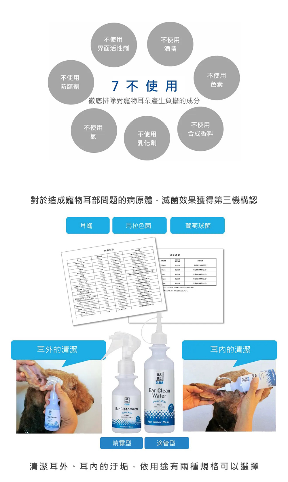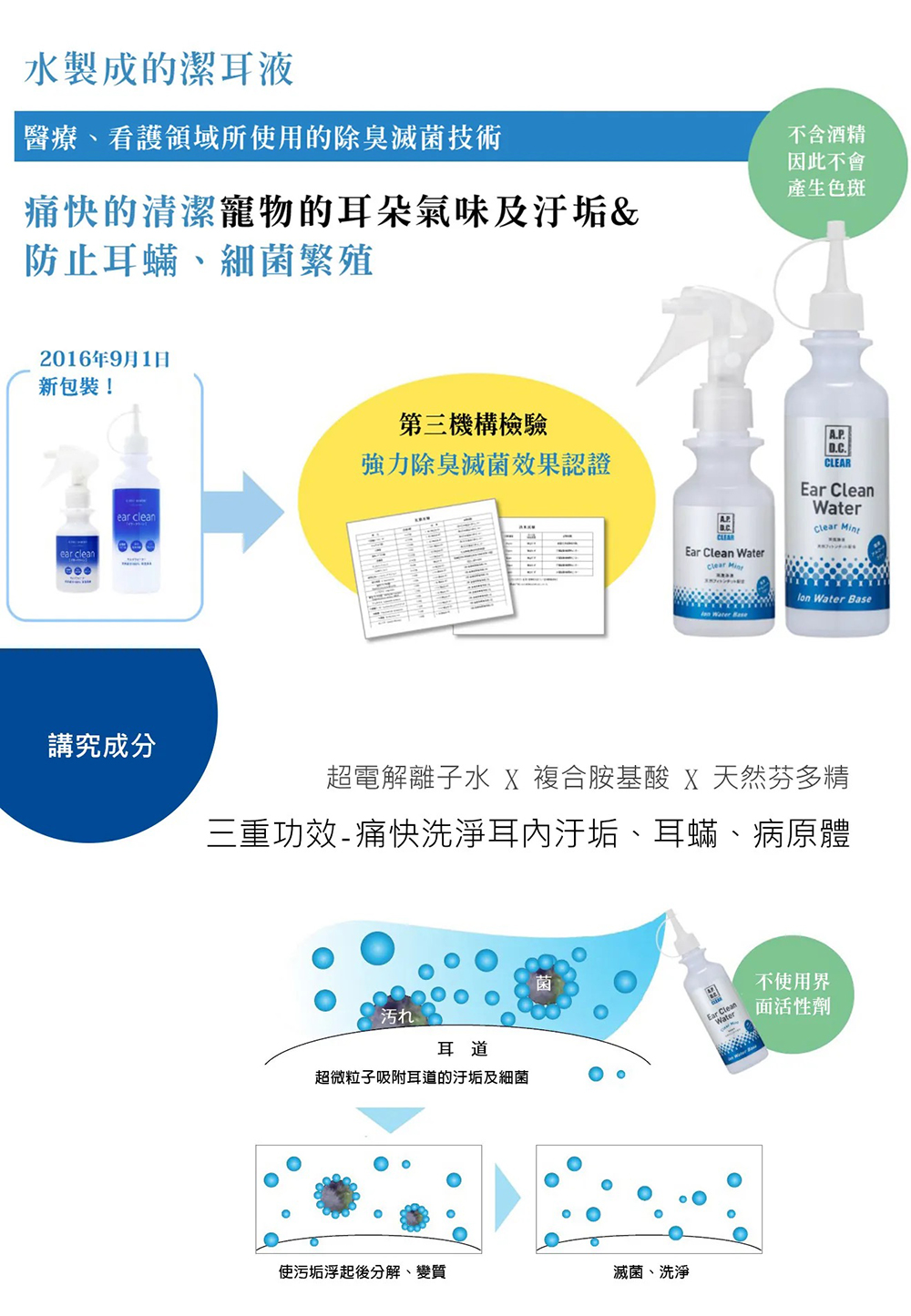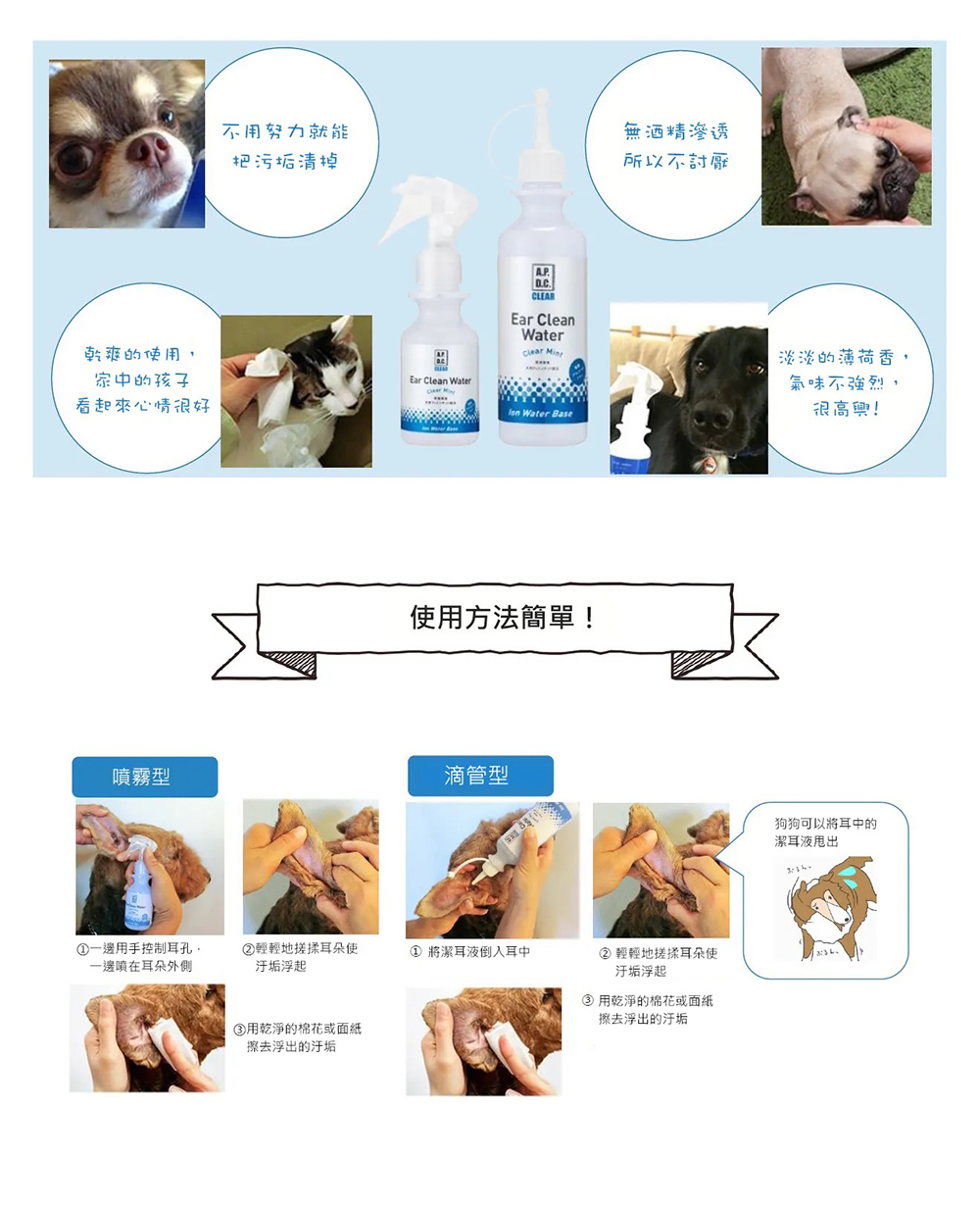 1.貼近耳廓噴幾下,輕輕地按摩耳根使污垢浮起,犬貓會自己甩頭將髒污甩出