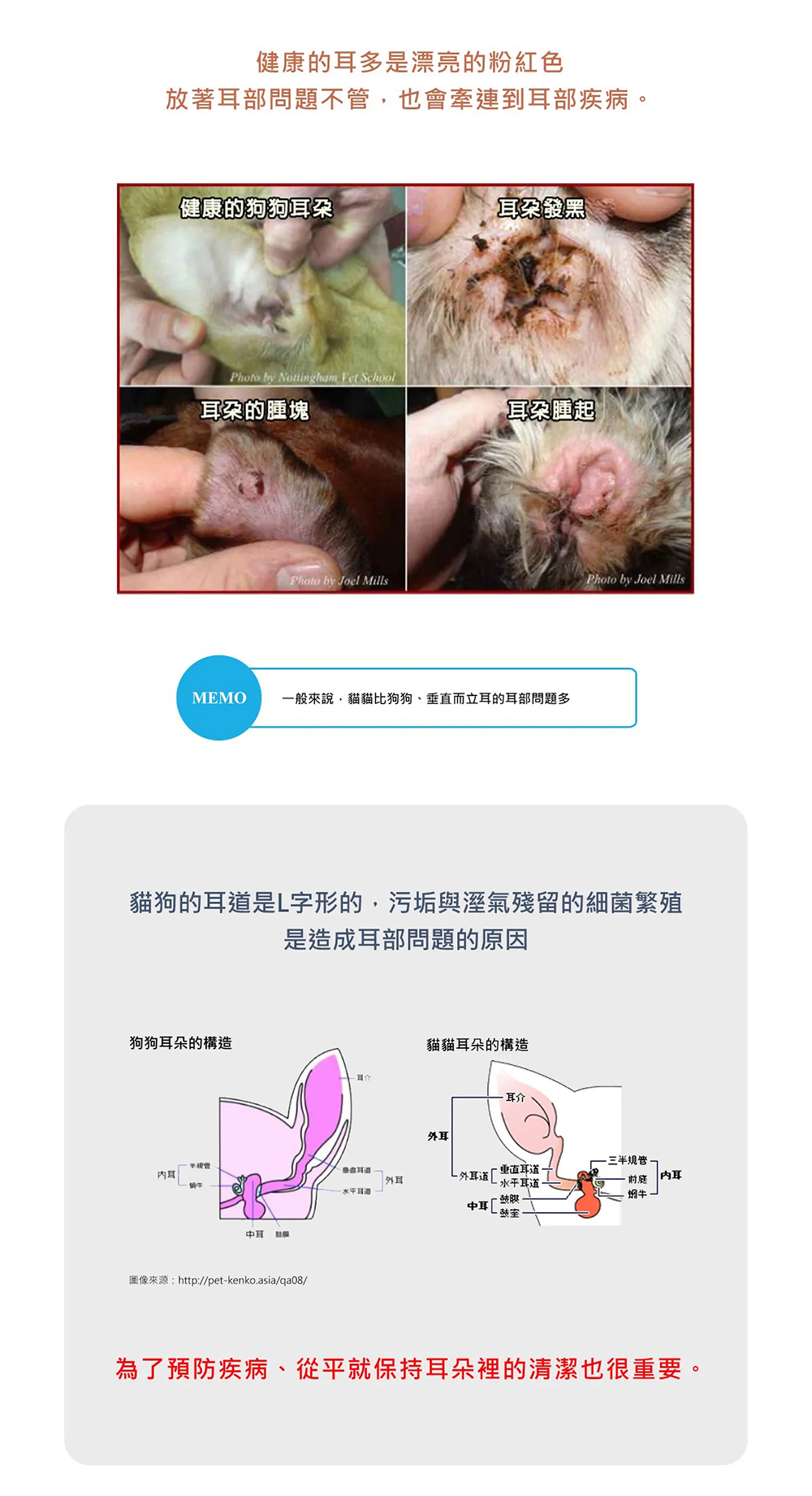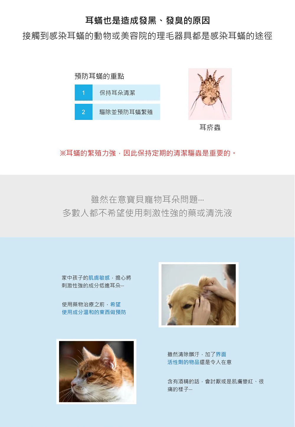 ● 溫和地去除耳垢等髒污,防止細菌及耳蜱的繁殖,抑止耳朵的臭味