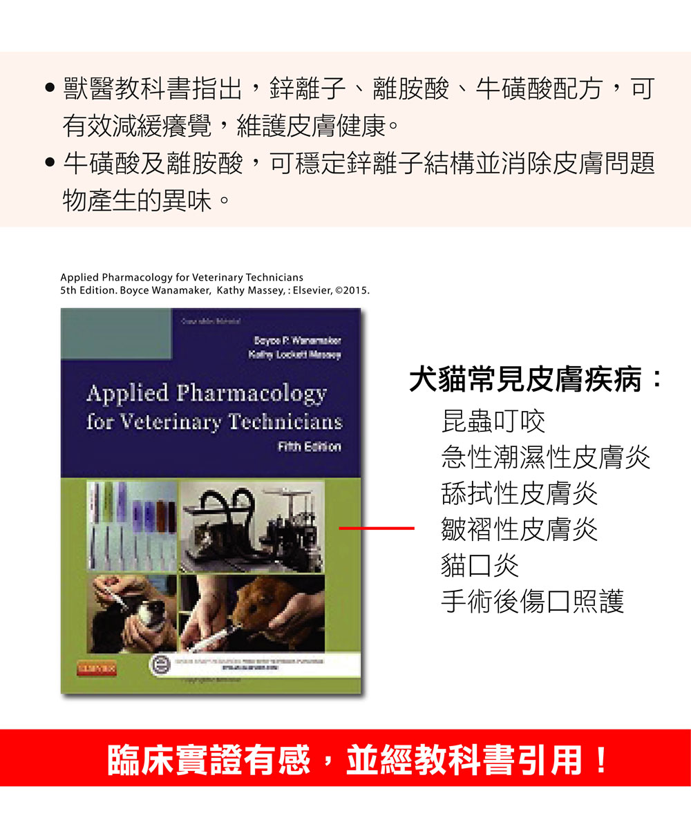 ● pH中性獨家配方,實證效果經獸醫教科書引用,不具刺激性、無味且無油膩感,維護皮膚健康