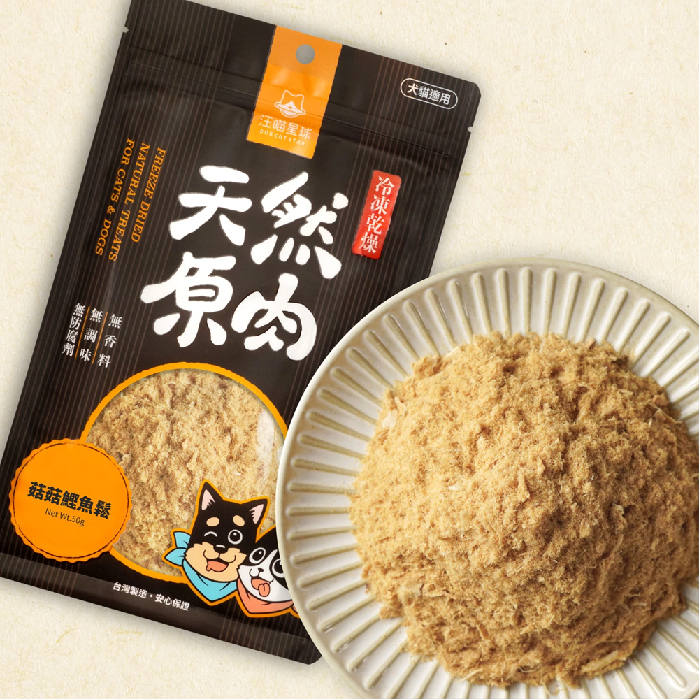 擁有日式湯底靈魂之稱的鰹魚,是家餘戶曉的美味代號。汪喵將新鮮鰹魚乾燥打鬆,並加入陸地上的免疫食補食材—有機姬松茸(俗稱巴西蘑菇)、高山猴頭菇,搖身一變成為養身又鮮美的鰹魚菇菇鬆。鰹魚富含 Omega-3脂肪酸、維生素 D、硒、牛磺酸• 嚴選養生菇類,豐富多醣體及微量元素,維持免疫力。