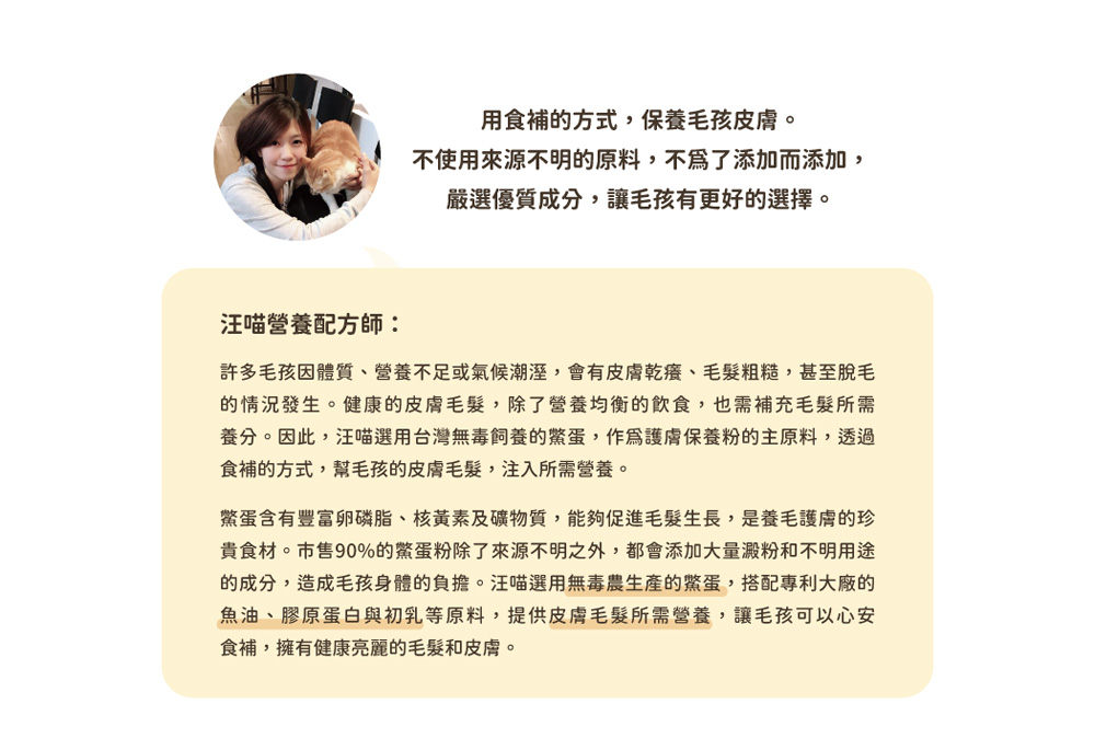 ● 汪喵選用台灣無毒飼養鱉蛋,不添加澱粉,成分來源透明