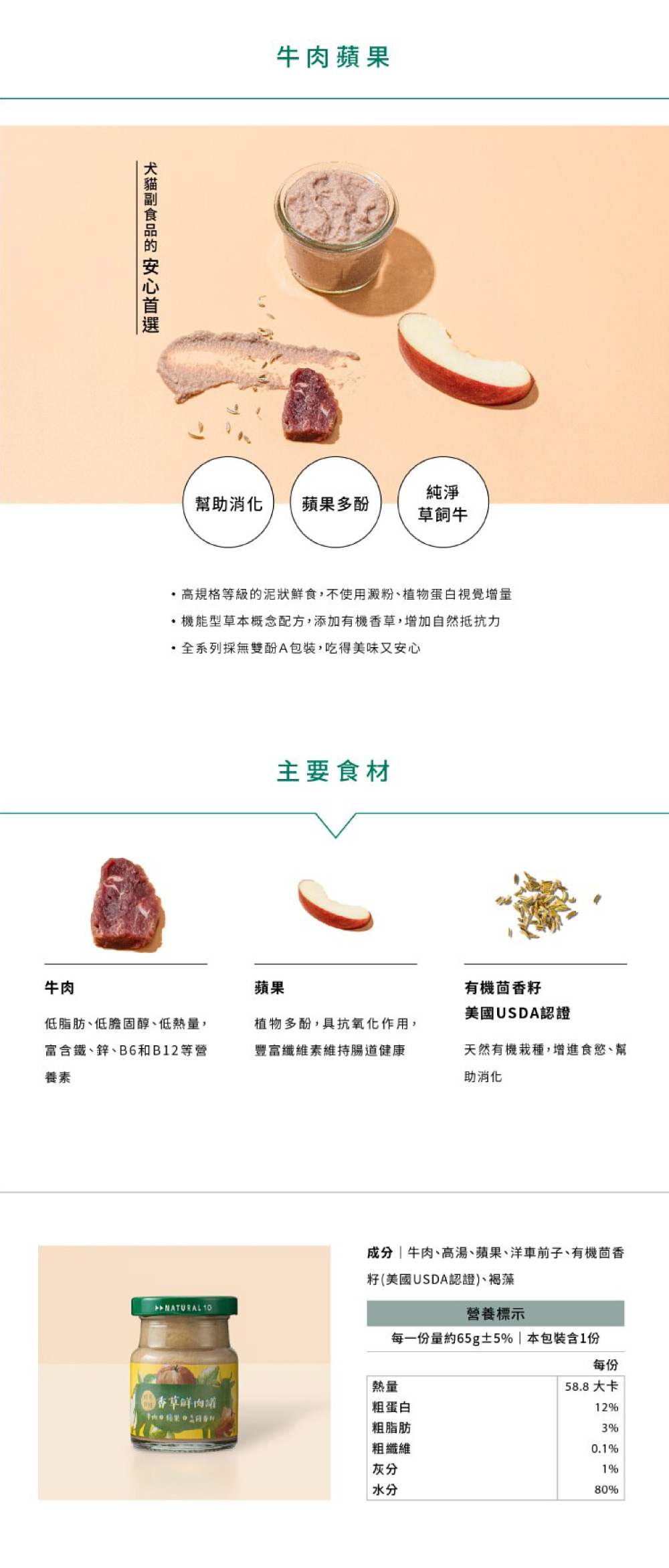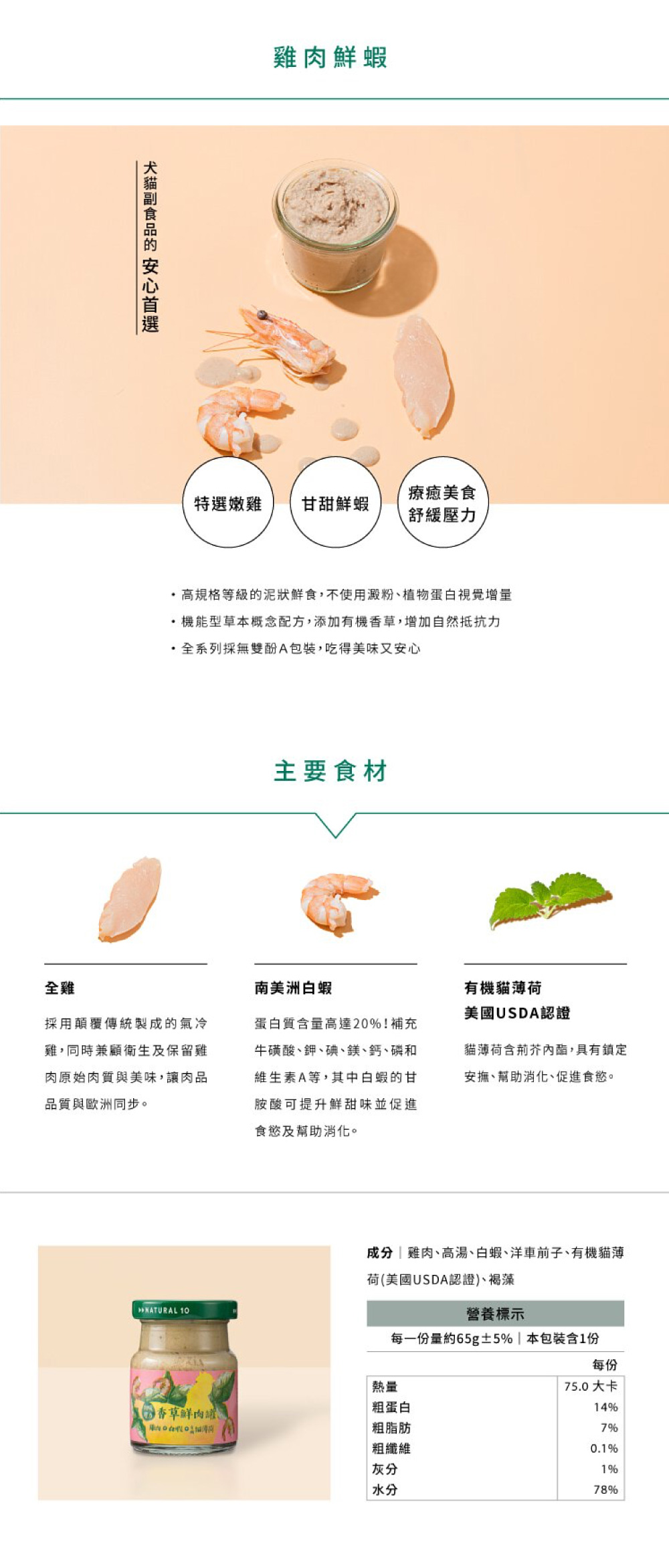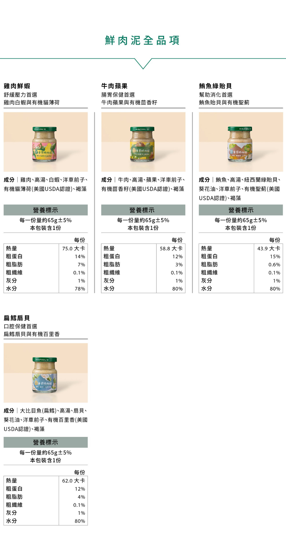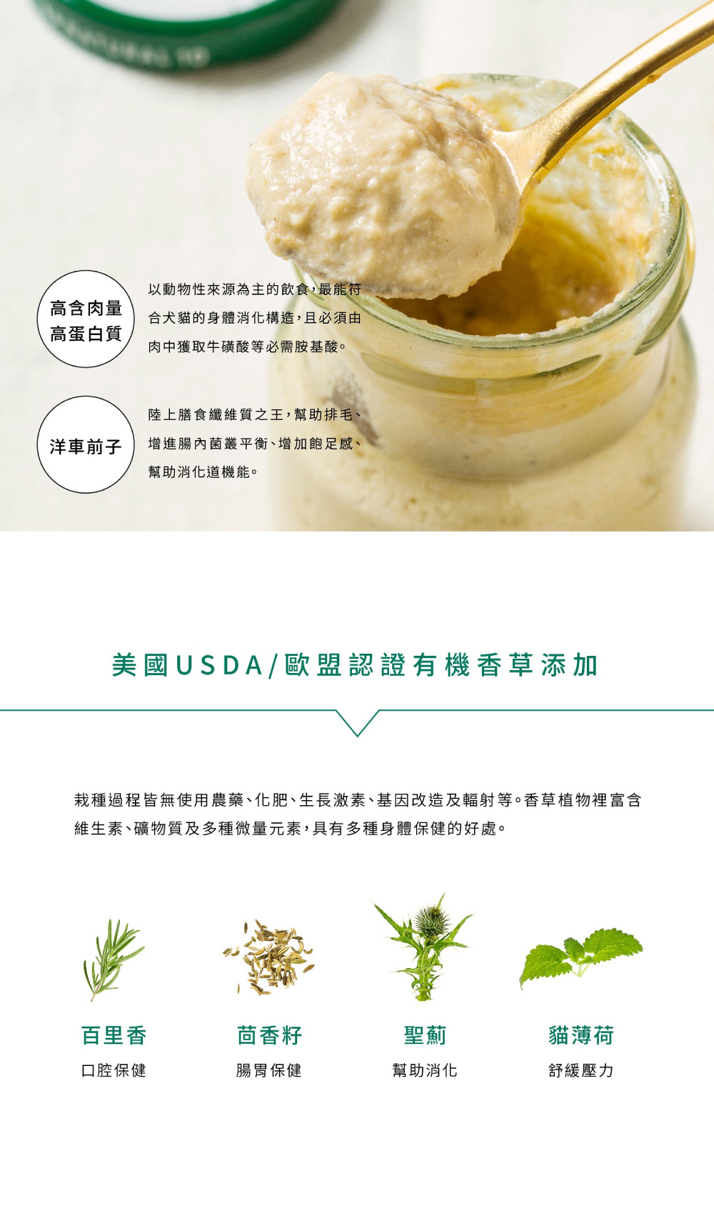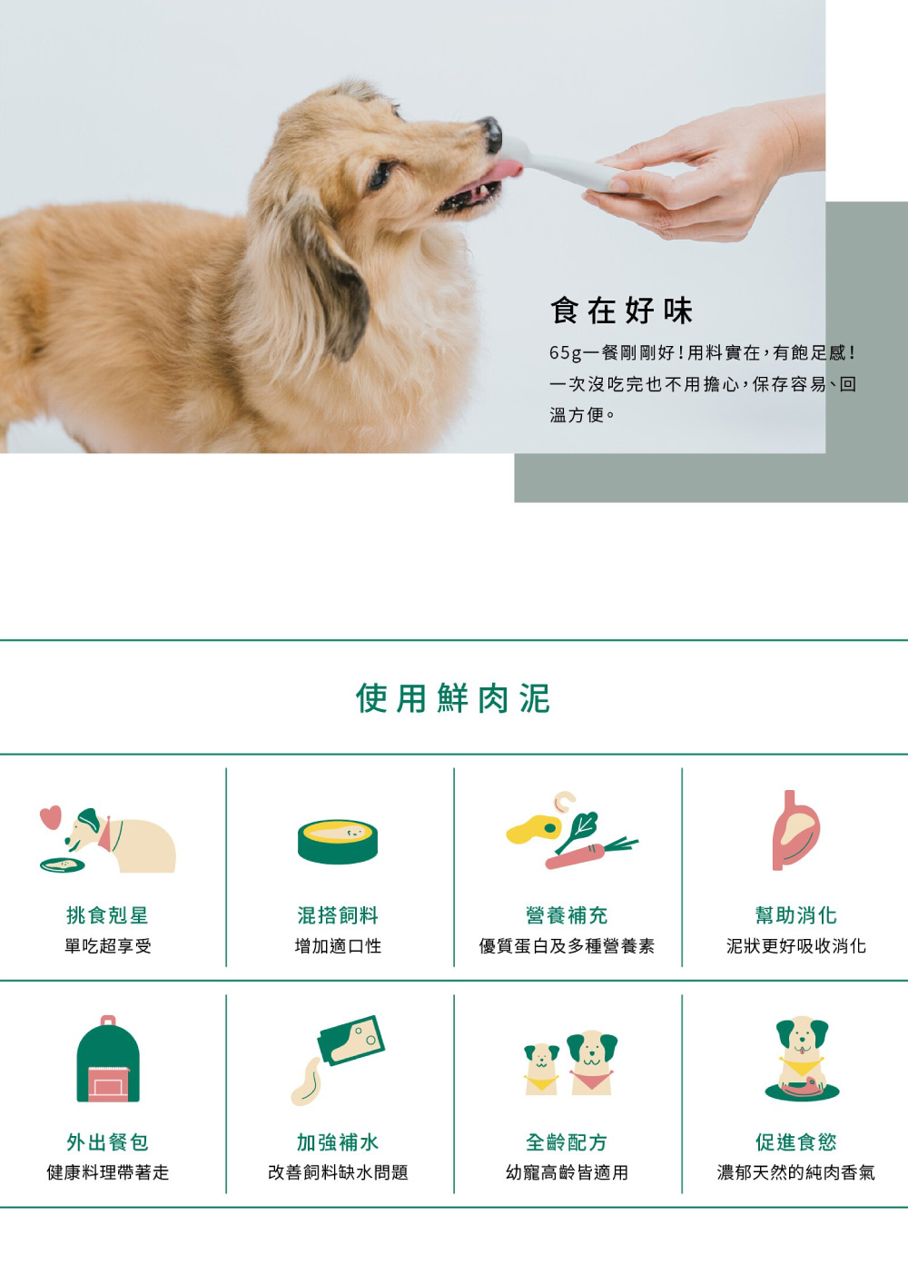 寵物鮮食、肉泥、副食、罐頭、濕食推薦!針對幼貓狗、老齡貓狗或是挑食、牙口不好、舔食習慣的狗狗貓咪設計,99%含肉量添加美國USDA有機認證香草,天然、健康、營養的鮮味肉泥。