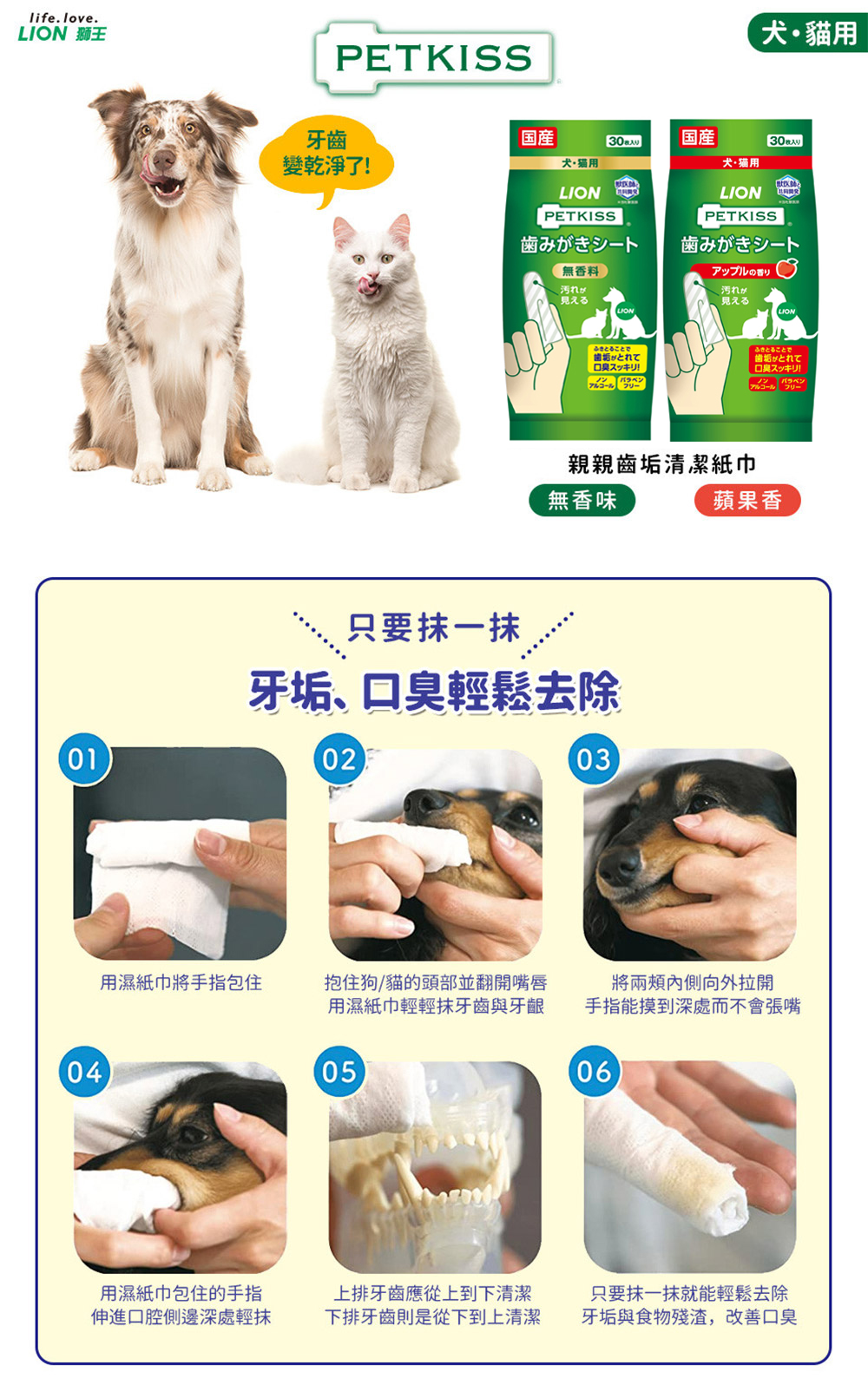 ● 只要在指上纏繞即可使用,方便又安心的寵物潔牙紙巾,齒垢和口臭通通清光光!