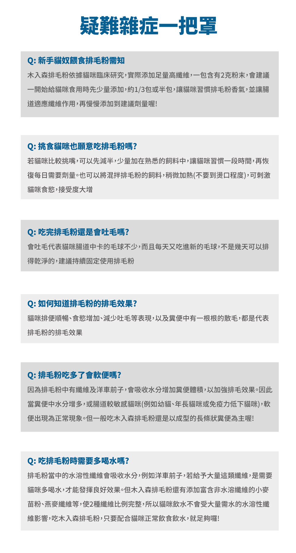 木入森排毛粉是用科學排毛的專業排毛粉,不只單純添加各種專利纖維與酵素排毛,且是真正破解「水溶性纖維 與 非水溶纖維 黃金比例」的排毛粉。